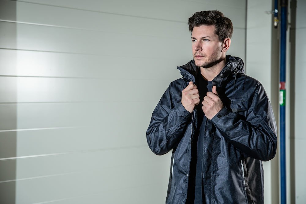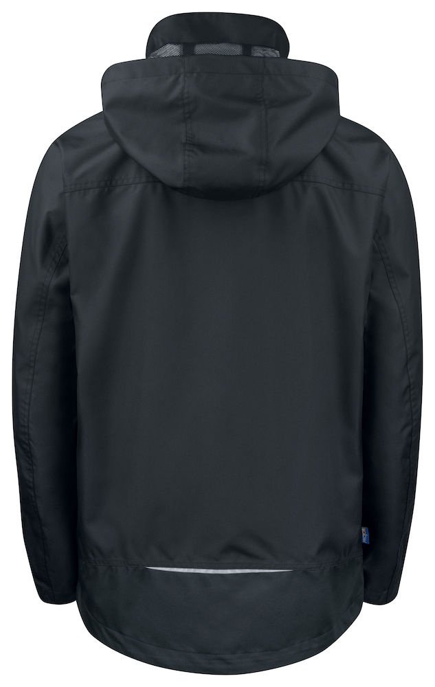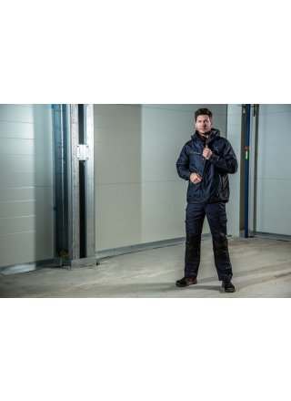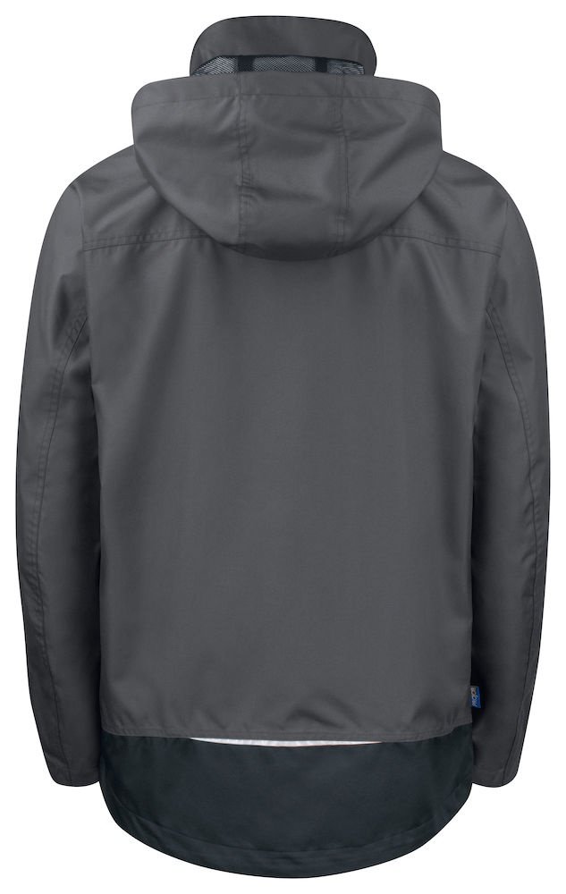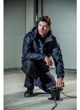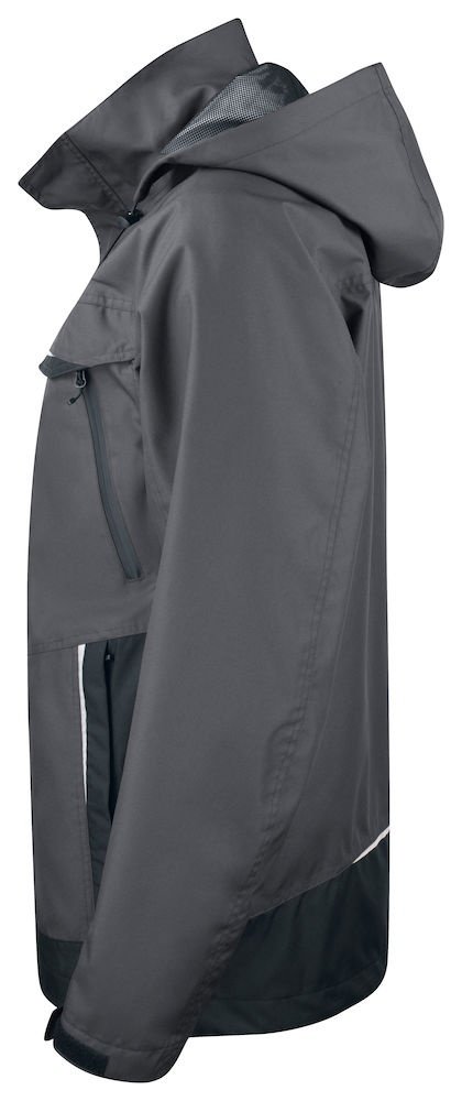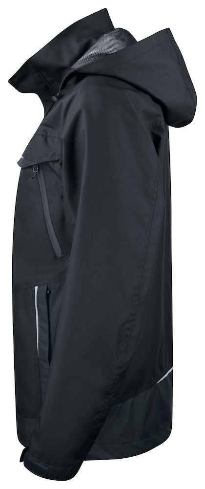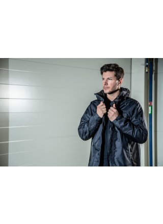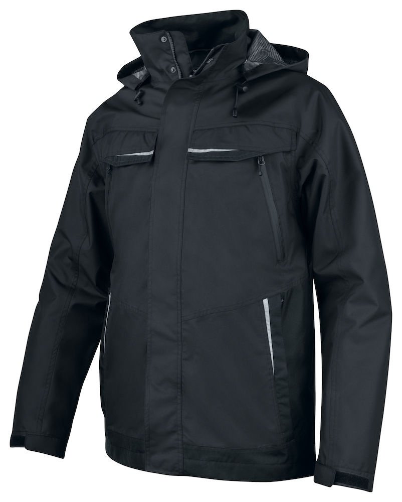 Wiatro- i wodoodporna kurtka typu softshell z klejonymi szwami. Dwukierunkowy zamek błyskawiczny z przodu (z patką zapobiegającą przeciekaniu wody) zapinany na zatrzaski. Podwójne kieszenie na piersi, dwie z patką i zapięciem na rzep oraz dwie z wodoodpornymi zamkami. Pętla do przypięcia dowodu osobistego po lewej stronie. Kieszenie boczne zapinane na zamek i podszewka z polaru. Trzy pojemne kieszenie wewnętrzne, dwie zapinane na zamek. Regulowany kaptur ze sznurkiem, odpinany. Regulowane mankiety zapinane na rzep oraz regulowany pas ze sznurkiem. Odpinana podszewka ułatwiająca wykonanie nadruków.