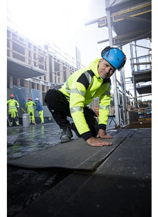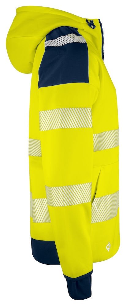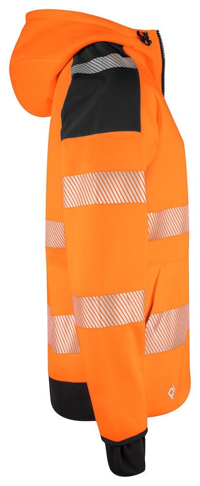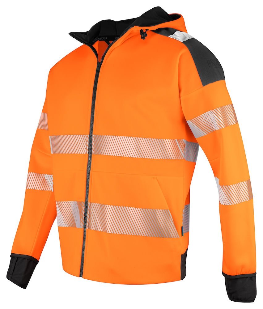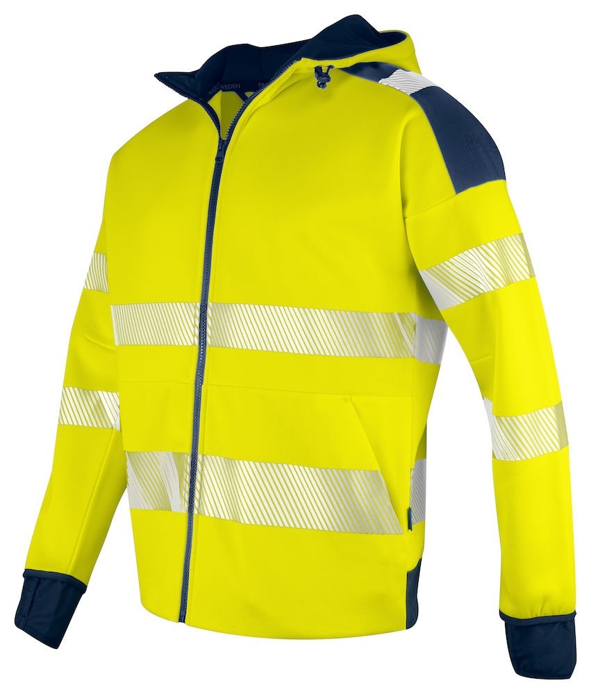 Rozpinana bluza z kapturem z kontrastowym kolorem na ramionach, w kapturze, mankietach i na dolnej części pleców. Dopasowany krój zapewnia maksymalną swobodę ruchów i wygodę. Pojemne kieszenie boczne zapinane na zamek, pojemne kieszenie wewnętrzne z siateczki. Dodatkowy mankiet na końcach rękawów z materiału softshell z uchwytem na kciuk. Elementy odblaskowe firmy 3M, obecne również na ramionach.