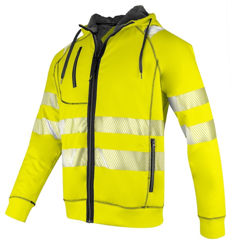 Bluza z kapturem z dodatkowym materiałem po wewnętrznej stronie, dzięki czemu bluza jest wyjątkowo ciepła. Kieszenie boczne zapinane na zamek. Pionowa kieszeń na piersi zapinana na zamek. Dwie wewnętrzne kieszenie. Regulowany kaptur. Dół i mankiety z dzianiny ściągaczowej. Elementy odblaskowe firmy 3M, obecne również na ramionach.