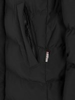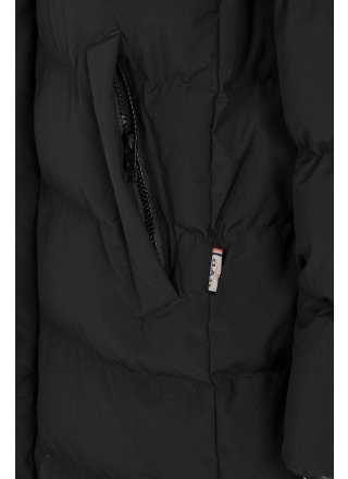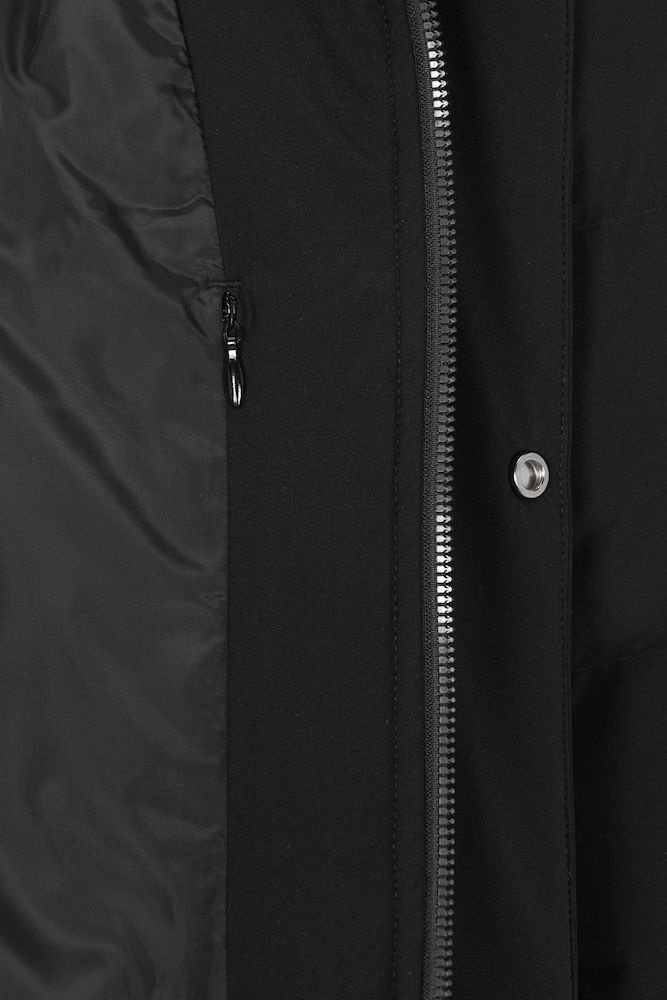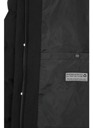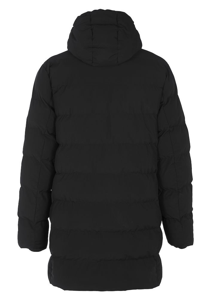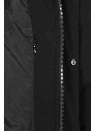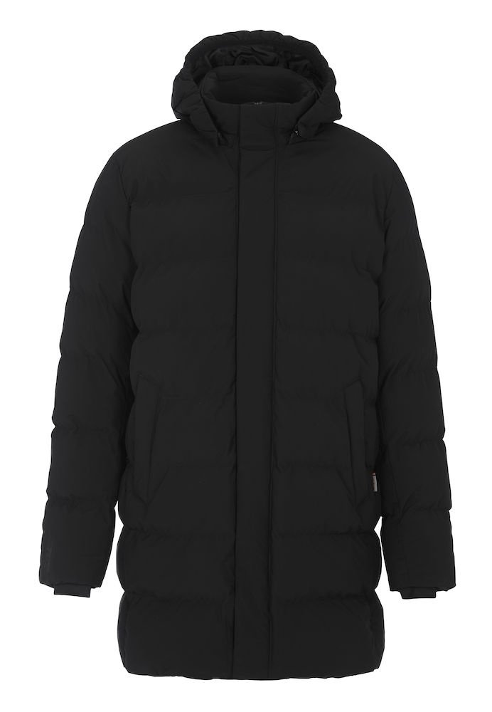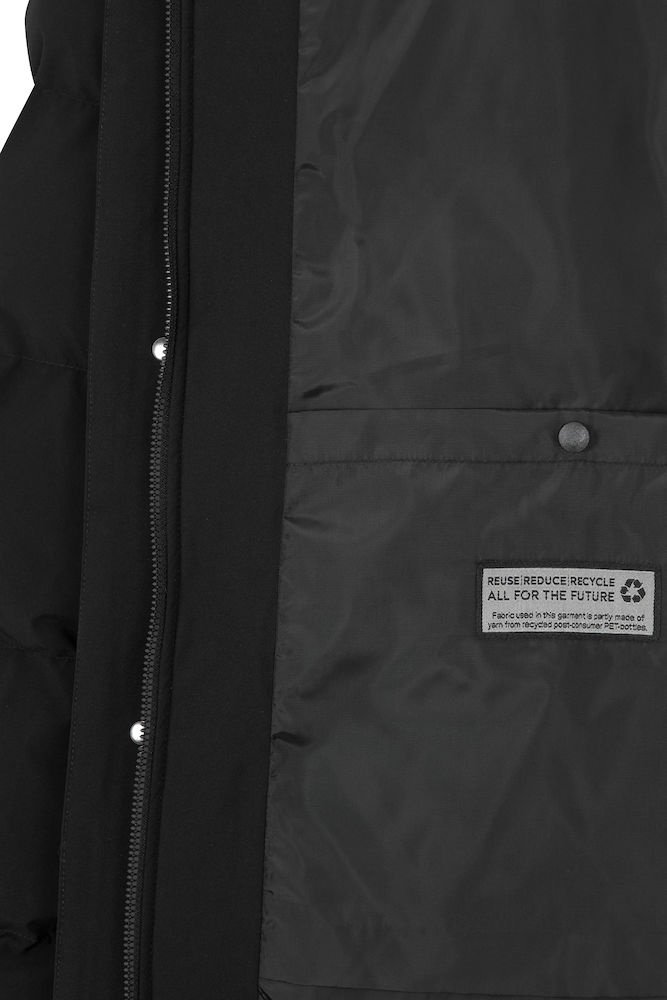 Grubo watowana parka z odpinanym kapturem, w całości podszyta szerokimi wszytymi kanałami. Wykonany z certyfikowanego poliestru pochodzącego z recyklingu, który jest odporny na wiatr i wodę (WP5000/MVP3000). Kurtka jest poddana obróbce końcowej za pomocą Bionic Finish Eco, który zapewnia również efekt hydrofobowy. Kryty suwak na całej długości biegnący w górę kołnierza i przednie kieszenie z suwakiem i patkami kieszeni. Trzy kieszenie wewnętrzne, w tym jedna zapinana na zamek. Mocna, ukryta gumka wokół otworu kaptura i wyjątkowo miękkie ściągacze przy mankietach. Lekko zaokrąglony model ze sznurkiem w talii dla lepszego dopasowania.