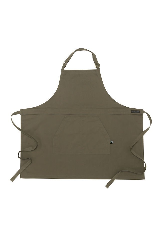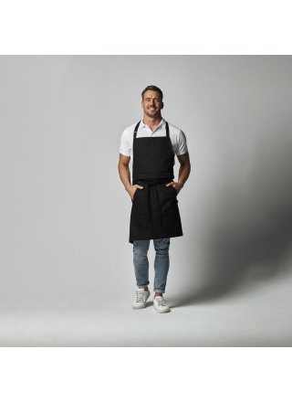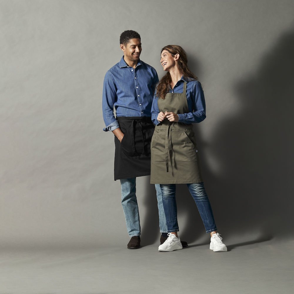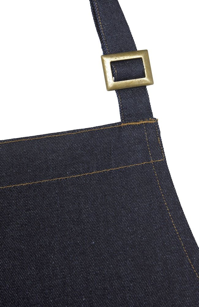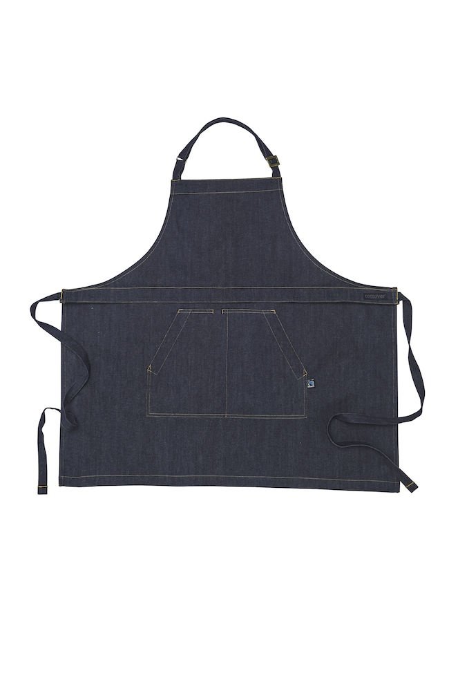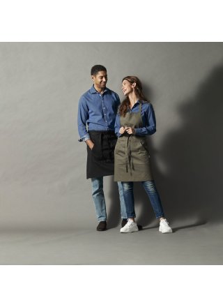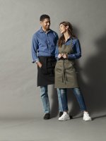 Wielofunkcyjny fartuch. Przednia kieszeń z przedziałem na środku oraz wiązaniem w pasie. Regulowany pasek na szyję, możliwość złożenia i ukrycia górnej części, aby nosić wyłącznie część od pasa w dół. Dekoracyjne przeszycia w pasujących kolorach nici w Twillu, część z jeansu ma żółty szew.