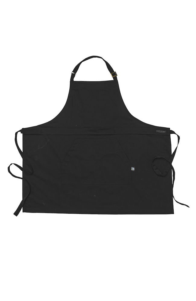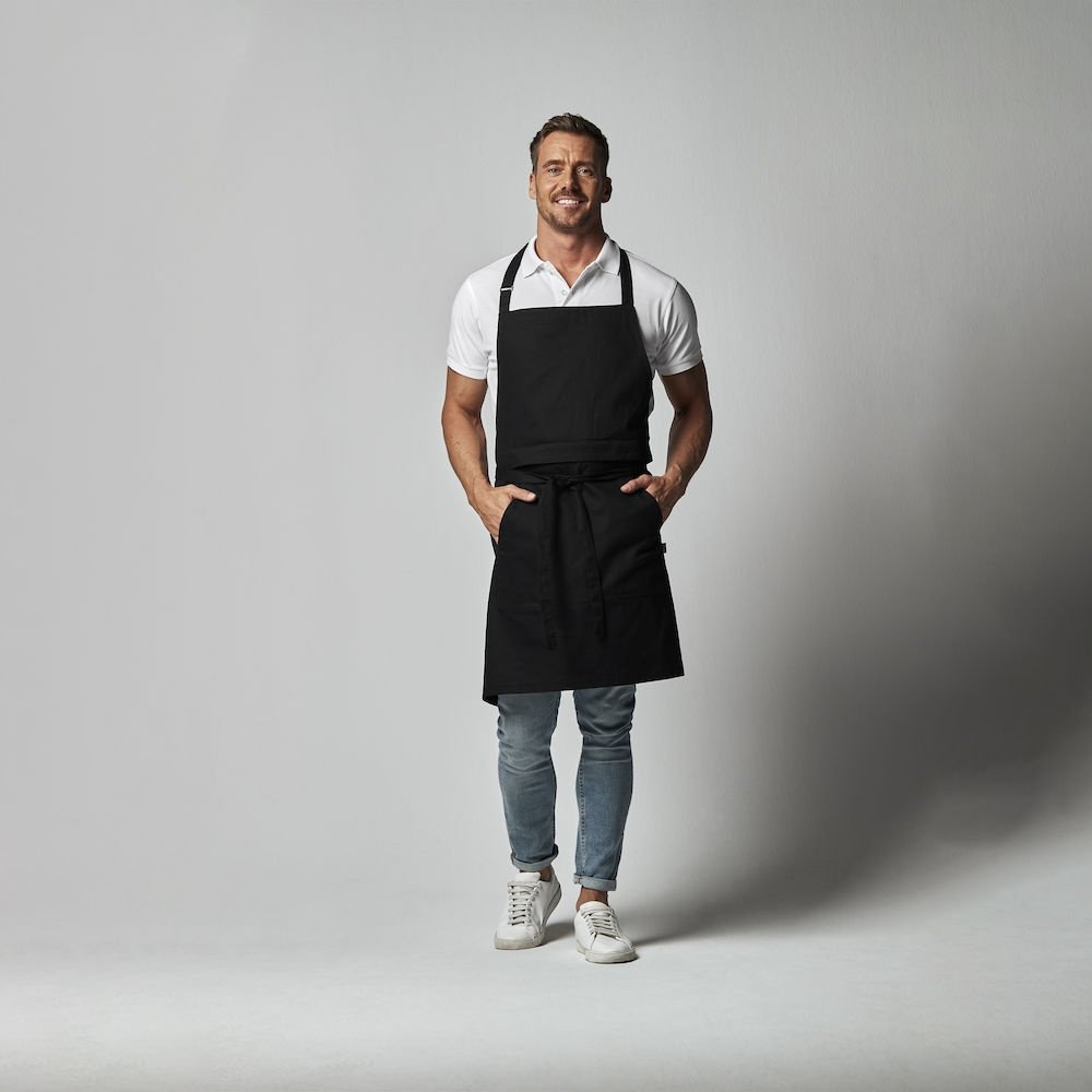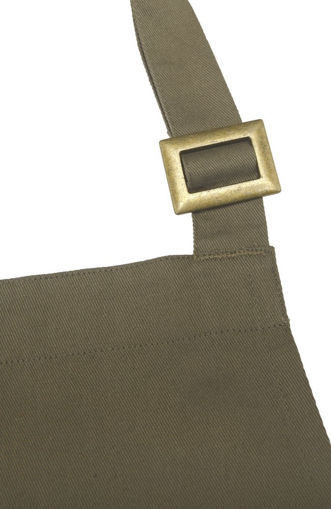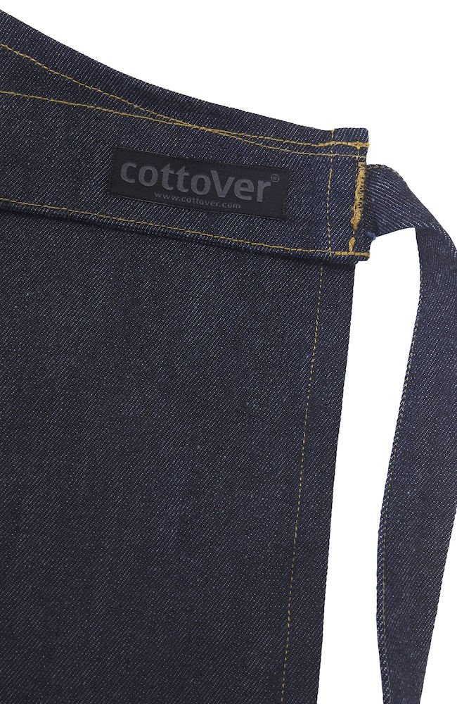Wielofunkcyjny fartuch. Przednia kieszeń z przedziałem na środku oraz wiązaniem w pasie. Regulowany pasek na szyję, możliwość złożenia i ukrycia górnej części, aby nosić wyłącznie część od pasa w dół. Dekoracyjne przeszycia w pasujących kolorach nici w Twillu, część z jeansu ma żółty szew.
