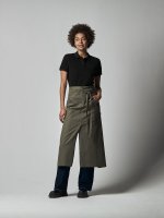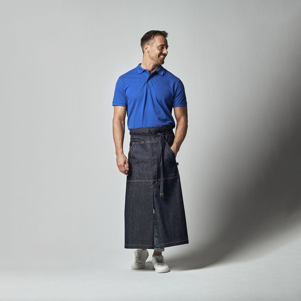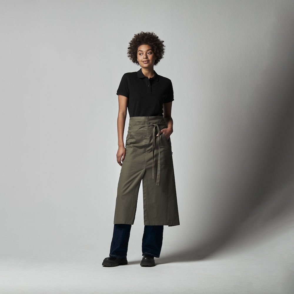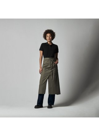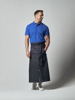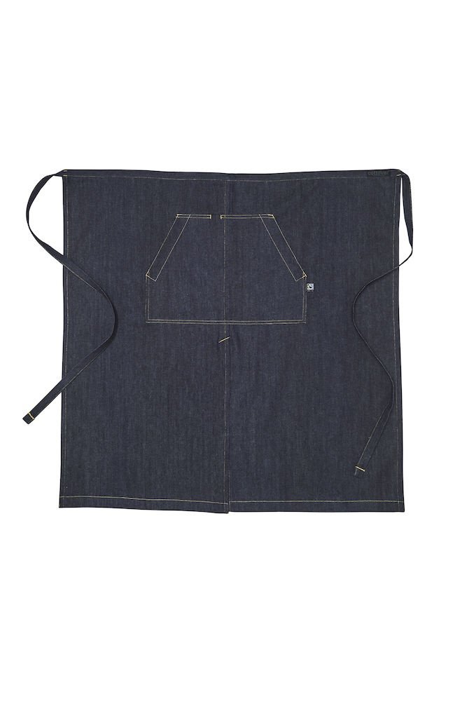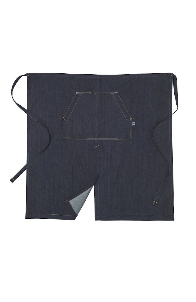 Długi fartuch z wiązaniem w pasie. Przednia kieszeń z przedziałem na środku. Wygodne długie przecięcie na środku. Dekoracyjne przeszycia w pasujących kolorach