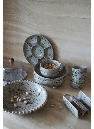 W szwedzkich domach tacos i tapas są bardzo częstymi goścmi. My w Sagaform zwróciliśmy na to uwagę już 20 lat temu. Teraz kultowa zastawa powraca do asortymentu, ale w nowy, bardziej nowoczesny sposób. Seria Ditte z talerzami i miseczkami doskonale nadaje się do przekąsek, tacos lub tapas, gdy zastawiamy stół na wspólny, rodzinny posiłek lub spotkanie z przyjaciółmi. Poszczególne części serii mają naturalne tony w kolorach beżowym i szarym z czarnymi kropkami. Seria wykonana jest z kamionki.