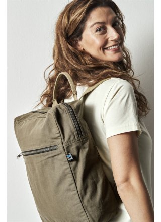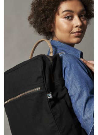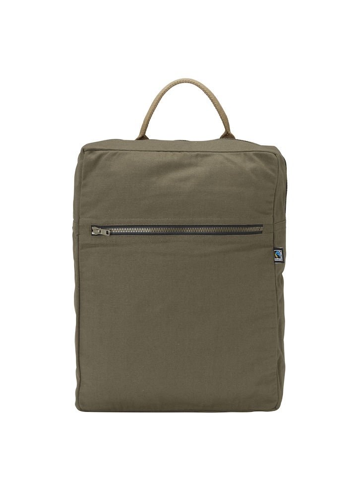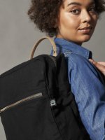 Plecak z elastycznego materiału imitującego płótno z kieszenią z przodu. Zamki YKK. Metalowe detale w brązie z klasycznym wykończeniem. Wewnętrzna kieszeń. Regulowane ramiączka oraz uchwyty, Czarna podszewka w obu wersjach kolorystycznych.