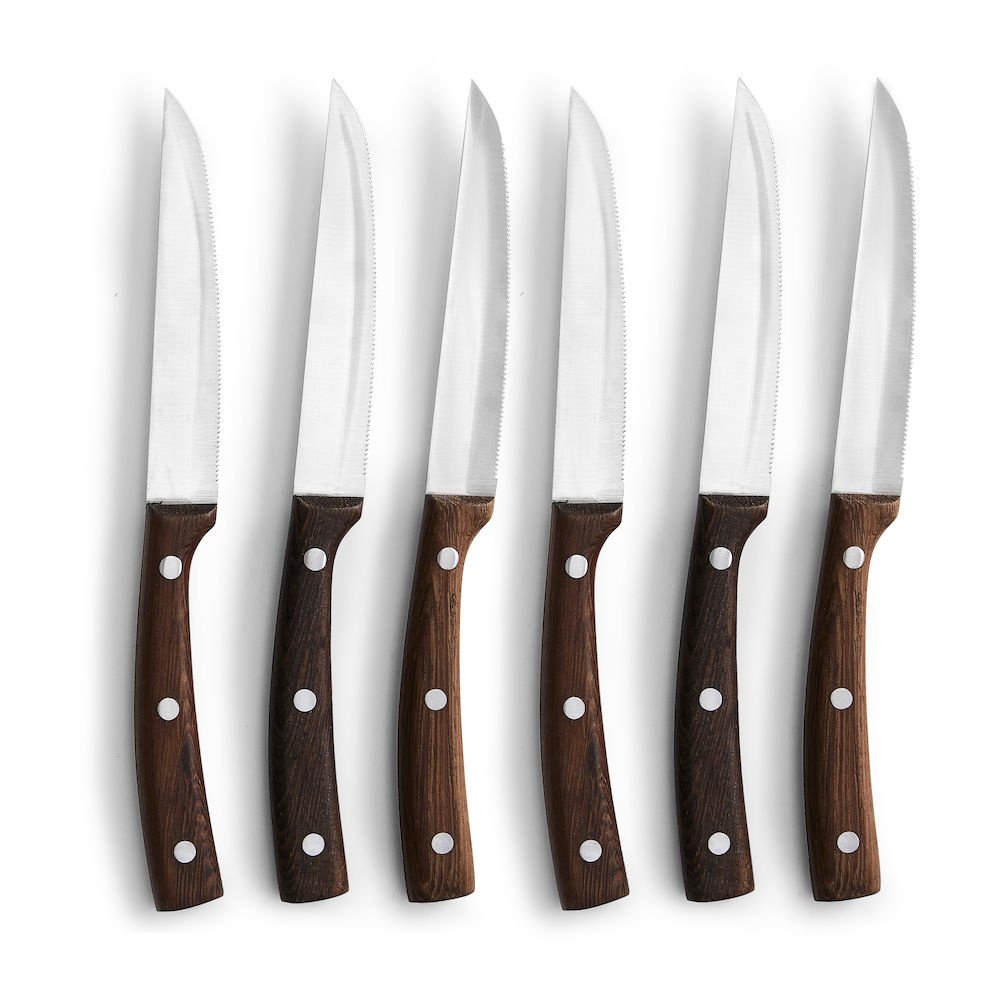 Zestaw 6, klasycznych noży do steków. Ostrze wykonane ze stali nierdzewnej, natomiast rękojeść z drewna wenge. Idealne do dań mięsnych.
