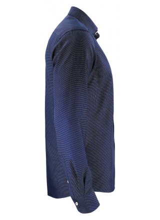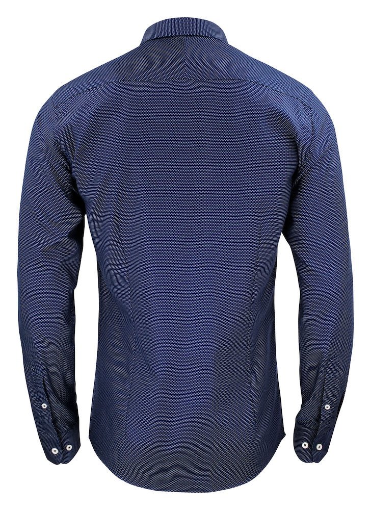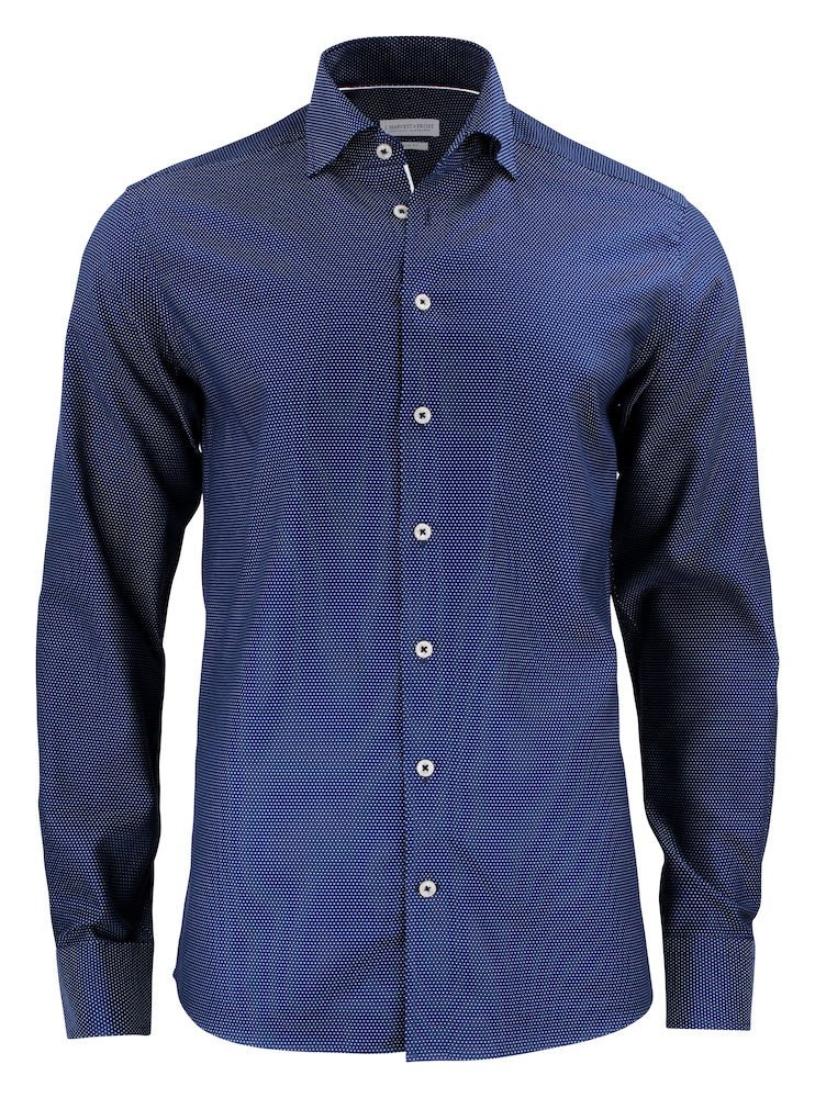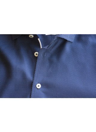 Żakardowa koszula w białe kropeczki na granatowym tle, która zapewni nowoczesny i wyrafinowany wygląd. Doskonale komponuje się zarówno z marynarką, jak i jeansami.