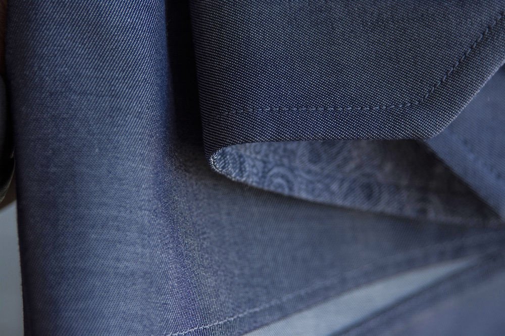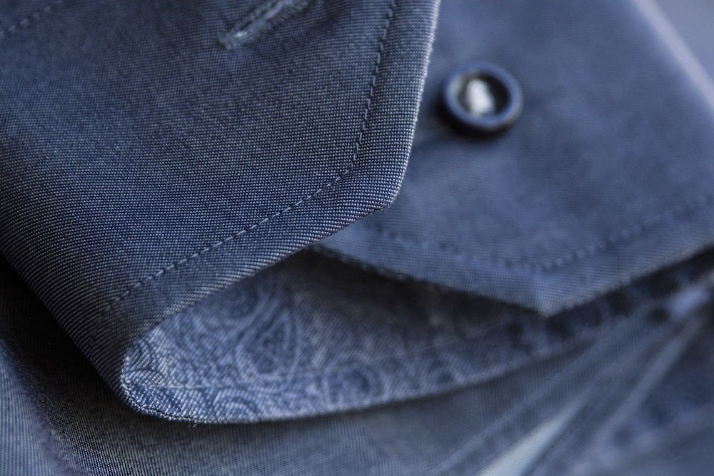 Koszula z linii Red Bow to optymalny wybór niezależnie od okoliczności. Charakterystyczny kolor indygo (odcień pomiędzy niebieskim i fioletowym) oraz tkanina o splocie skośnym (diagonalna) sprawia, że przypomina nieco jeansowe koszule. Kołnierz i rękawy od wewnątrz ozdobiliśmy wzorem Paisley (znany również jako wzór turecki). Białym kolorem wykończyliśmy plisę i guziki.